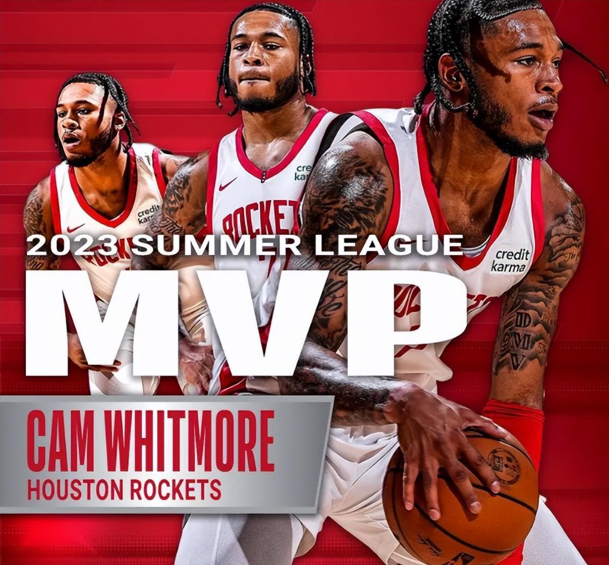 加盟火箭后,惠特莫尔在新秀赛季立即展现了巨大潜力。2023年夏季联赛,他在5场比赛中场均31.5分钟可以砍下20.4分、5.6个篮板、2.2次助攻和3次抢断,不仅入选夏季联赛最佳阵容第一阵容,还当选了夏季联赛MVP。